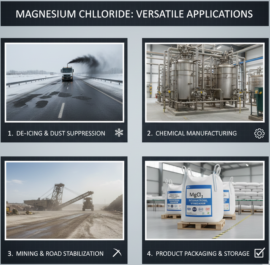 کلرید منیزیم به عنوان یک عامل مؤثر ذوب کننده یخ و برف، باعث کاهش خطرات ناشی از لغزندگی سطح جادهها و معابر شهری می شود. این ماده در دماهای پایین تر از بسیاری از نمک های سنتی عملکرد بهتری دارد و آسیبی به آسفالت یا فلزات خودروها وارد نمی کند.